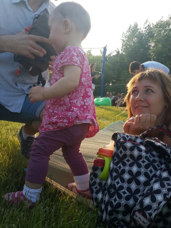 На фотографии я валяюсь на травке, а Ника гуляет сама по себе) но, чувствую, не долго мне так валяться, скоро буду бегать и ловить ее везде)