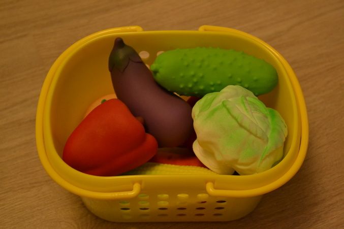 Поиграли с резиновыми овощами, вспомнили названия. (Овощи - фабрика "Огонек")