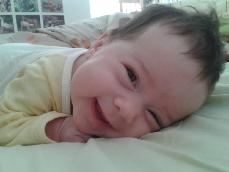 Уже на животике так хорошо держит голову. ) А у меня младшая ленится на животе, перевернешь ее, а она голову набок повернет и лежит глазеет.