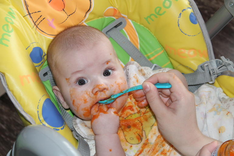 Кушаем уже: яблоко, грушу, чернослив, морковь (после нее так плохо одежда отстирывается, кстати), тыкву, кабачок. Из каш кушаем только гречневую и кукурузную, купила овсяную, но из-за прививки и аллергии на нурофен пока не вводила. Начали кушать творог, покупаю Тему или Бабушкино Лукошко фрукты с творогом.