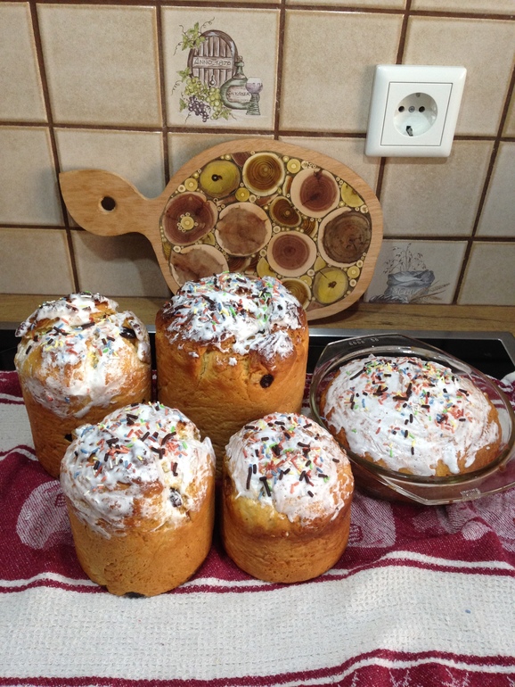 Привет. Влезу в вашу переписку. Я несколько рецептов перепробовала. Остановилась на этом. Куличи получаются очень пышные и воздушные. Когда их достаёшь с духовки, они кажутся совсем невесомыми. Главное, что они при этом влажные и очень вкусные. Неделю можно как свежие кушать. Потом делаешь с остатков вкуснейшие сухарики к чаю. Я делаю треть порции, которая указана в рецепте. Топленое масло сама делаю, легко. Можно просто растопить, я разницы не заметила. Куличи всегда получались. В этом году я завтыкала в фейсбуке. Дрожжи у меня убежали, я разделила белок и желток не туда, не взбила белки с сахаром и в результате они увеличились в 2 раза. Обычно минимум в 3 раза вырастают. Всё равно вкусные.