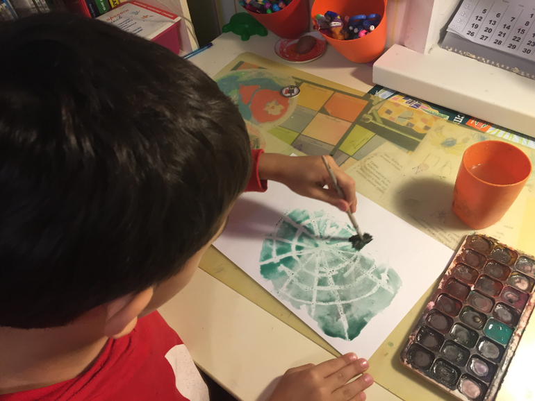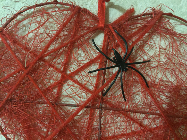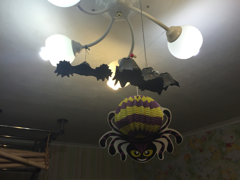 В детской Левик захотел украсить стеллаж паутиной и прошлогодней гирляндой. На занавески наколол тыковок, которых мы тоже наделали в большом количестве в прошлом году. Люстру украсили так...