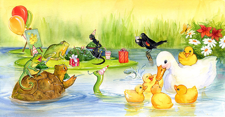 Мама-утка думает, что ее 5 маленьких утят мирно спят в своих кроватках. Но что это за шум? Она возвращается к деткам, открывает дверь, а там...танцы-пляски, кряканье, драка подушками...Маме срочно нужен помощник, чтобы уложить разбушевавшихся утят!
