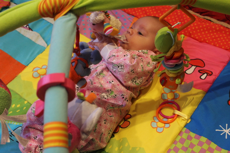Наконец собрали развивающий коврик и Варя стала тянутся к игрушкам, хватать их и пробовать на вкус)