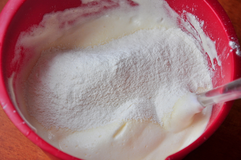 Просеиваем прямо во взбитые яйца, муку с разрыхлителем и аккуратно, заворачивающими движениями лопаточки, сниху вверх, укутываем муку в яично-сахарную пену.