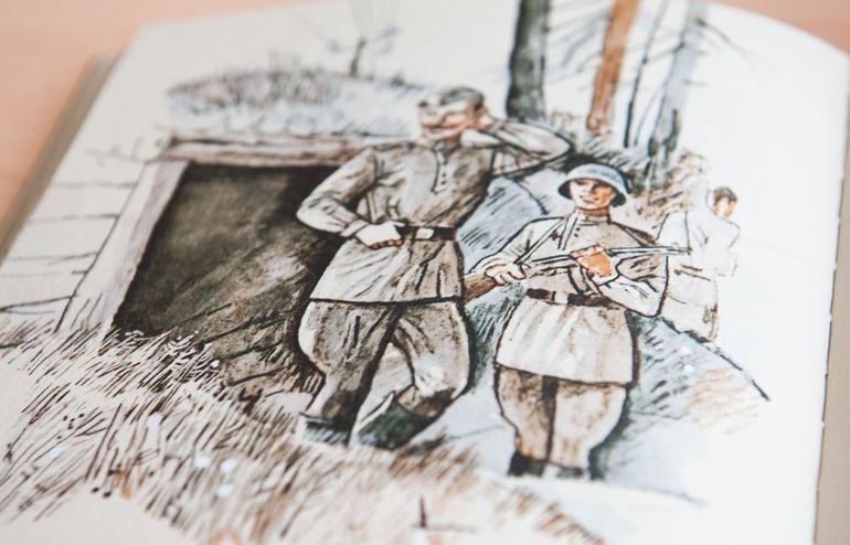 Книга представляет собой сборник из шести рассказов: "Треугольное письмо", "Серьги для ослика", "Длинное ружье", "Опасный суп", "Отпуск на 4 часа", "Кто брал Берлин". В каждом из них отсутствуют ужасные кровопролитные сцены, но тем не менее слог автора и иллюстрации к нему настолько животрепещущие, что патриотический дух военной эпохи пронизывает до самого сердца. Мы прочитали только пару рассказов, но безусловно вернемся к этой книге в ближайшее время. На мой взгляд она подходит для трехлетнего ребенка. Посмотрите какой форзац.. дрожь берет только от него...