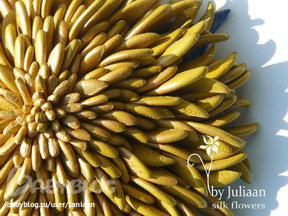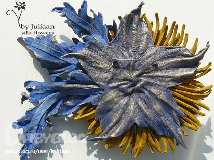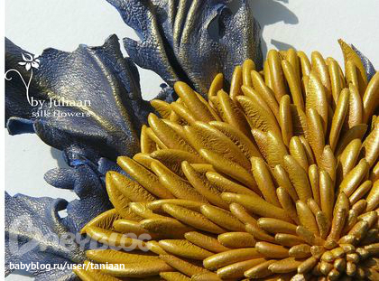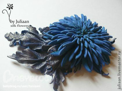 Хризантема сделана из натуральной итальянской кожи. Обработана и покрашена вручную. В отличии от шелковых цветов, не требует настолько бережного отношения и не боится влаги (в разумных пределах конечно..))