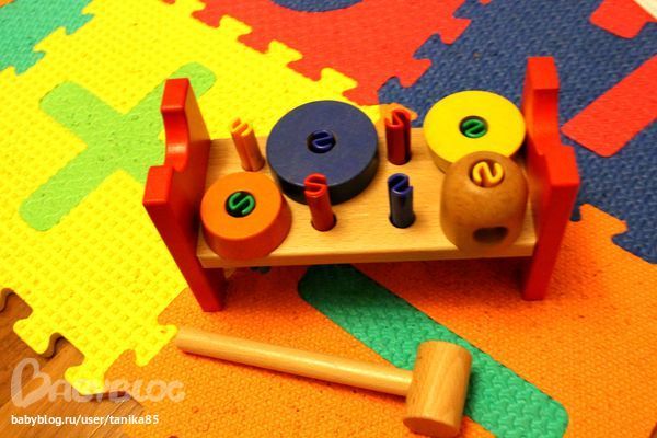 10. пирамидки, абаки, лабиринты и простейшие паззлы - давно освоено, иногда еще играет для разнообразия, но необходимо пополнить запасы в ближайшее время. Из последнего - стучит в икеевскую стучалку) Я ее немного усложнила с помощью икеевской же пирамидки, чтобы было интереснее: