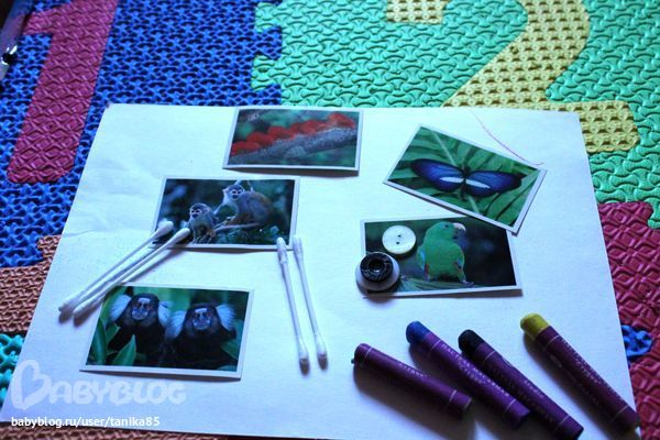 В круглое мы засовываем ватные палочки и сегодня пастель, в плоское - пуговицы и наклейки с животными. Наклейки сначала смотрим