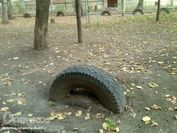 А на улице сегодня придумали новую уличную забаву: ходим по покрышкам. Я придерживаю за руки правда. Вот по таким: