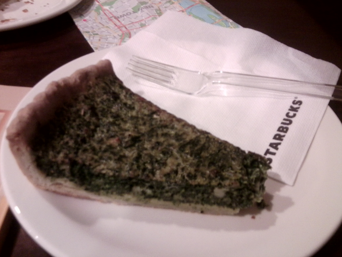 Мы решили, что пора бы погреться, зашли в Старбакс. Я там ни разу не была, а муж был в Лондонском. Мест на первом этаже не оказалось, мы потащились на второй с коляской. Интерьерчик весьма такой..аскетичный. Кофе обычный ( у нас дома вкуснее даже), а вот пирог со шпинатом мне понравился )