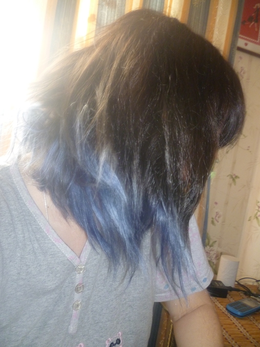 Девочки на днях сделала себе Омбре синим цветом , сегодня вышла на улицу ,ну правда с собраной гулькой на голове и словила в магазине кучу взглядов на своей голове .:) Посмотрите как вам ? Хочу сделать синий более насыщенным цветом чем сейчас :