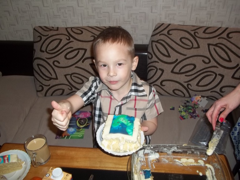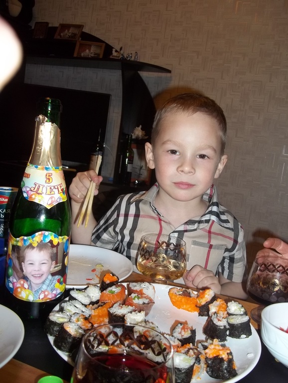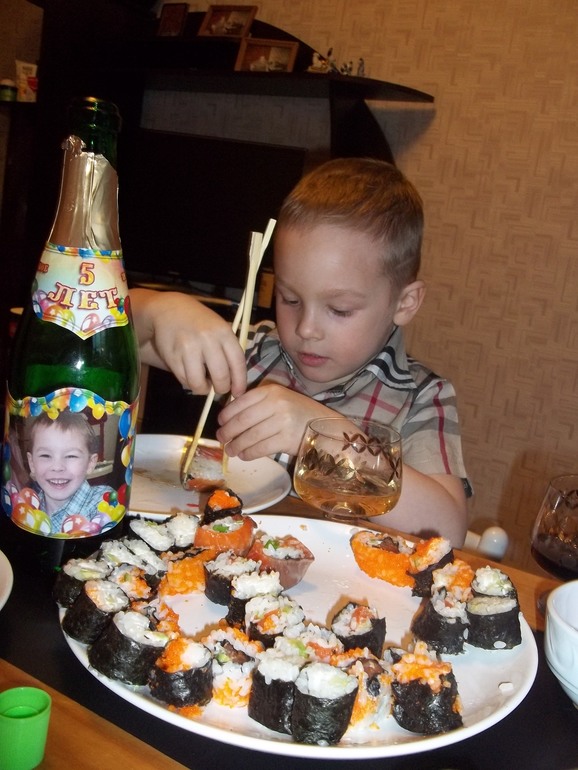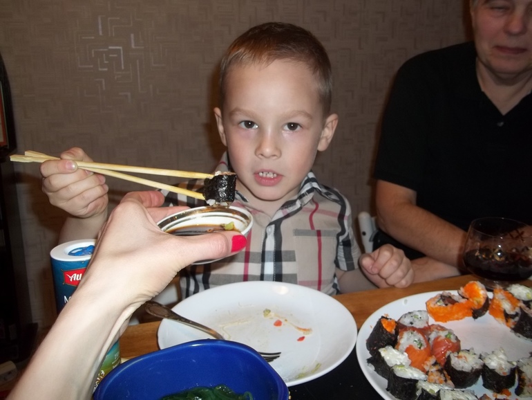 Первый раз попробовали суши сделать сами, и Вова стал их есть, при чем палочками.