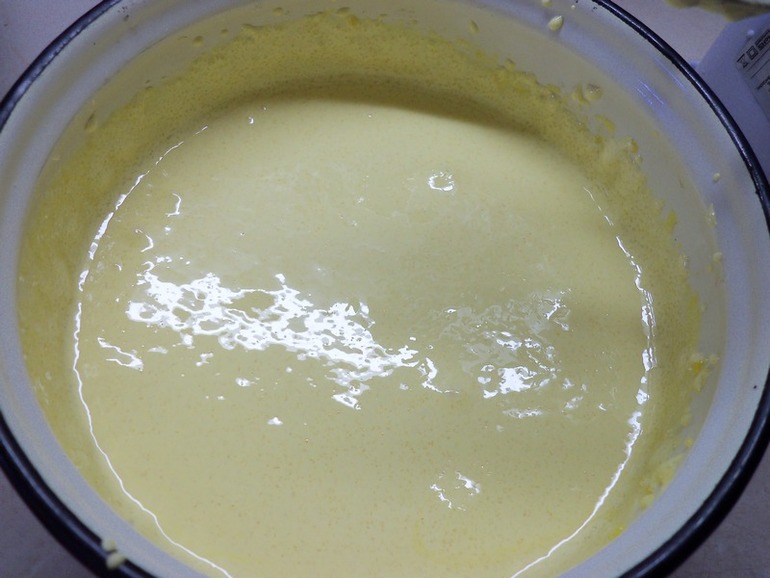 6) Теперь в тесто добавляем желтки с сахаром. Перемешиваем.