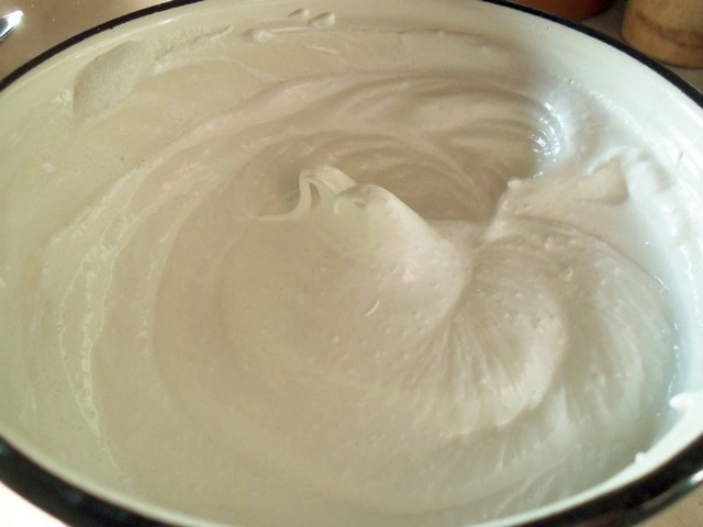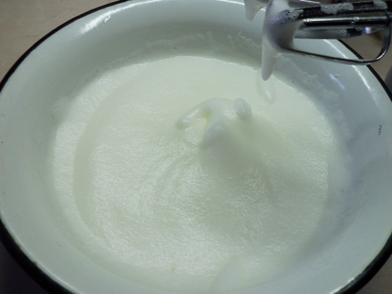 13) Для помадки белки с лим. кислотой взбиваем в густую пену. Не выключая миксер постепенно кладём сахар. Взбиваем до тех пор, пока масса не станет густой, вязкой и будет тянуться за миксером.
