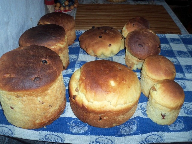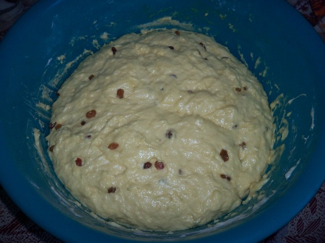 Ингредиенты для теста : молоко - 500гр., яйца ( у меня утиные) - 6шт., маргарин( или сливочное масло) - 300гр., ванилин - 1 пакетик, дрожжи сухие - 1 пакетик( 11гр.), сахар- 400гр., мука....- не знаю)) около 1,2-1,5кг., изюм- 100гр.