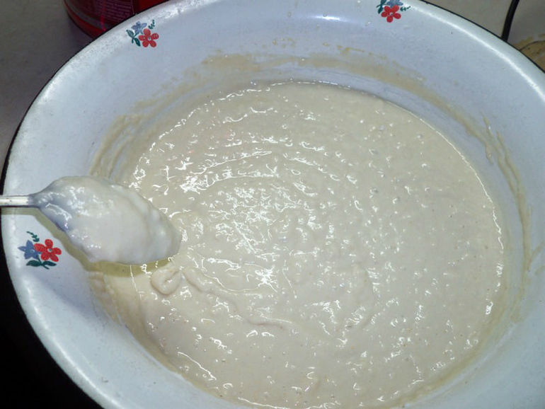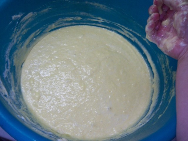 5) В опару кладём мягкий маргарин( масло). Руками перемешиваем до однородной консистенции.