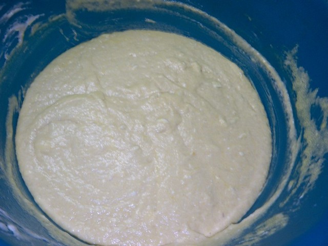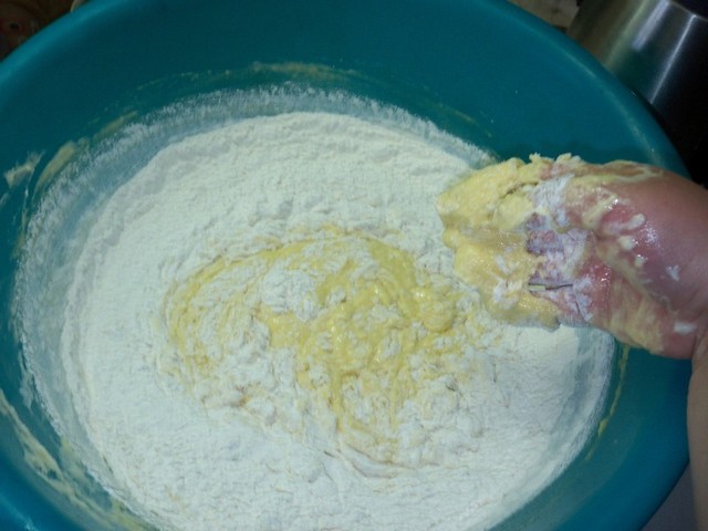 8) Настал черёд муки. Важно класть её порциями. Не переборщите и не "забейте" тесто.