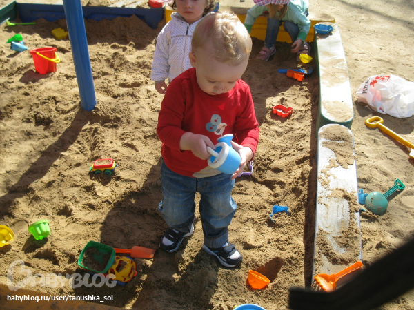 ооо, песочница!!! как же наш любит песочницы. тоже, мильон лопат, совков и формочек, где чьи уже никто не знает :))) с улицы вообще не затащишь. только обещанием дать бутылку :))) без обещния - только с визгами и дрыганьем ногами.