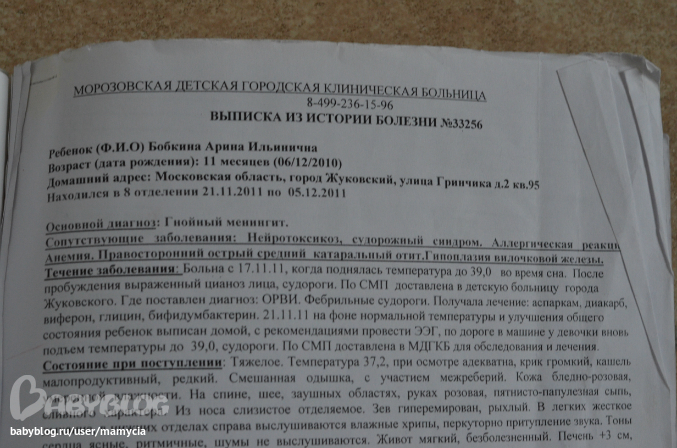 Началось все в ноябре 2011 ,моей малышке было 10 мес, и я заметила,что она трогает ушки и капризничает. Мы обратились к лору ( в нашей городской пол-ке) , она осмотрев нас сказала,что небольшой отит есть , что надо покапать отипакс.Что мы и делали, прокапали отипакс,держаться за ушки доча вроде перестала, но стала еще капризней. И вот примерно через неделю после похода к лору, у дочери поднимается температура 38,( у не в 4 мес 1 раз была такая температура, но через день все благополучно прошло- подумали на зубы) я не стала давать ей нурофен- т.к . считала,что организм должен бороться и до 38,5 давать жаропонижающие препараты не нужно.Уложила её спать, она проспала 2 часа, проснулась, я посадила её на кухне и она играла на одеялке на полу ( она еще не ходила ) ,прошло минут 5-10 , я смотрю, а она вся обмякла и её сильно трясет.........Я ТАКОГО НИКОГДА НЕ ВИДЕЛА,но почему-то срау поняла,что это судороги на температуру, т.к. знала,что у детей бывает такое. Но ,когда я её перевернула ,то увидела,что она без сознания- глаза закатились вверх и дыхание оч прерывестое... В диком ужасе я позвонила в скорую помощь раз 7 , за 5 минут........ Женщина всё кричала на меня,что уже едут и ,что бы я не звонила больше..... Но я не могла не звонить, т.к доча перестала дышать и стала фиолетовая,а губы синие......Я решила,что все это конец.....К приезду скорой помощи, её перестало трясти и оч много жидкости вылелось из носа... По -скорой ей померили температуру 38,7 и забрали нас с ней в городскую больницу. Где нас пролечили от ОРВИ вифероном и жаропонижающими уколами, от которых ей на время становилось хорошо. Через 5 дней нас выписали, с рекомендаций сьездить в невромед и сделать Энцефалограмму ГМ,что бы определить,что с мозгом.. Но обнадежили,что такое бывает у детей до года на температуру... В день выписки мы поехали в Москву в Невромед. По подьезду к Невромеду ,в машине у нас начинаются судороги , я в панике уже начитавшись,что надо раздевать детей и класть на бок и создать приток воздуха, раздеваю её до памперса - заматываю в куртку мужа ( на улице зима ) и бегом в невромед, там нам вызвали скорую и забрали в Морозовскую больницу, где через 3 часа нам был поставлен точный диагноз ГНОЙНЫЙ МЕНИНГИТ... Я была в шоке и молилась лишь о том,что бы дочь выжила- т.к. состояние у неё было уже тяжелое.. Не буду описывать, что мы там пережили, всевозможные обследования, МРТ ,энцефалограммы ,пункции и т.д. Но нас вылечили и в свое годовасие мы приехали домой и надеялись,что все у нас позади. Но не тут -то было.. Не прошло и 2-х месцев ,как у нас вновь поднимается температура и вновь судороги - точь в точь как в первый раз ........опять больницы -антибиотики - гормоны...... Через два месяца снова- тоже самое - потом опять и опять и так каждые 2 месяца в течении года ...........Когда судороги случились в 4 -й раз нам выписали Депакин в сиропе ( противосудорожное средство) но он нам не помогал ....... Последний раз в реанимацию мы попали 23 февраля 2013 года, и у нас случилось 6 приступов подряд - её никак не могли выести из судорог и было решено отключить мозг с помощью медикаментозной комы и подключить аппараты искуственной вентиляции легких. Это был АД.