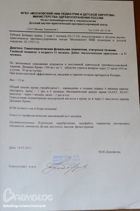 Чем мы только не лечили её - ездили в клинику НЭП на Павелецкой ( благодаря родственникам оплачивающим нам лечение - мы сделали 3 курса магнито-терапии,это оочень дорого 1 курс 120 тыс. ) Но нам не помогло!! И вот когда судороги случились в последний раз , я в палате познакомилась с мамой и дочкой больных эпилепсией и они посоветовали поехать в НИИ Педиатрии на Талдомскую к Дорофеевой Марине Юрьевне ( за .что я им буду пожизненно благодарна )