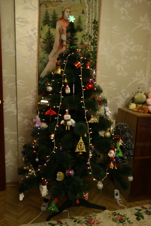 Украшена игрушками небьющимися, так сказать - во избежание.... Отчасти - самоделками.