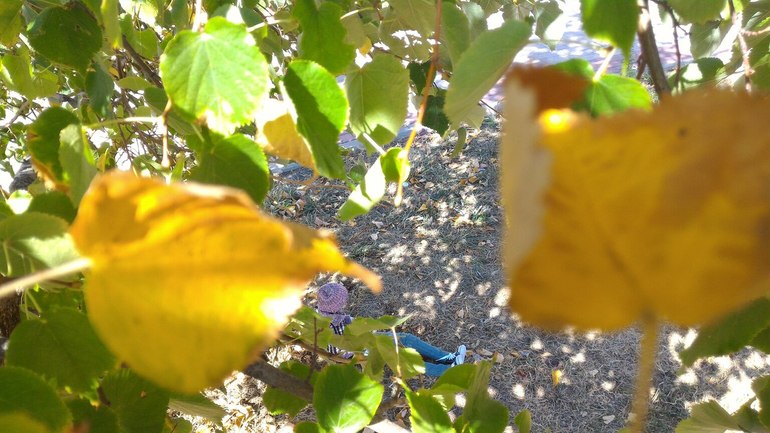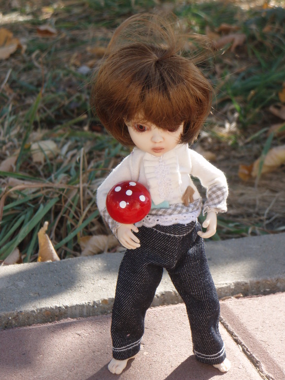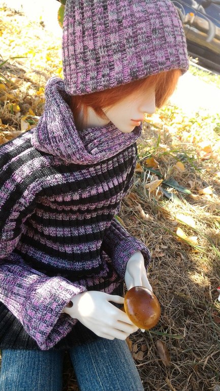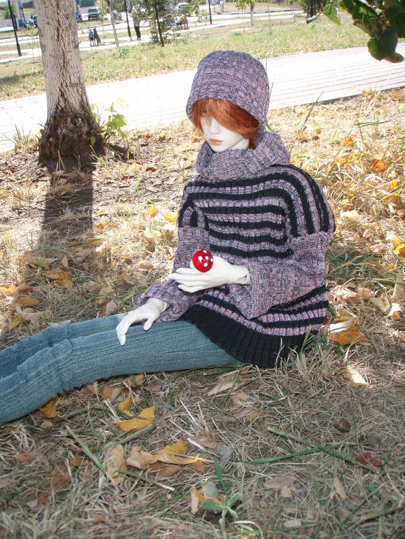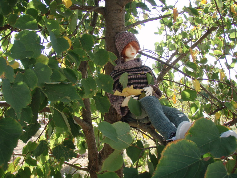 Ну и как же не посадить кукла на дерево. Нельзя не посадить кукла не дерево. (Погода, кстати, жарень жаренью, но я только намедни дошила осенний прикид... первый, прикид, которым я довольна, хотела такой безразмерный длинный свитер - да и вообще у нас тематический осенне-грибной выход, ну и что