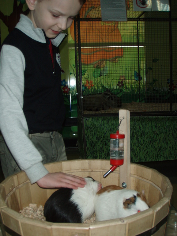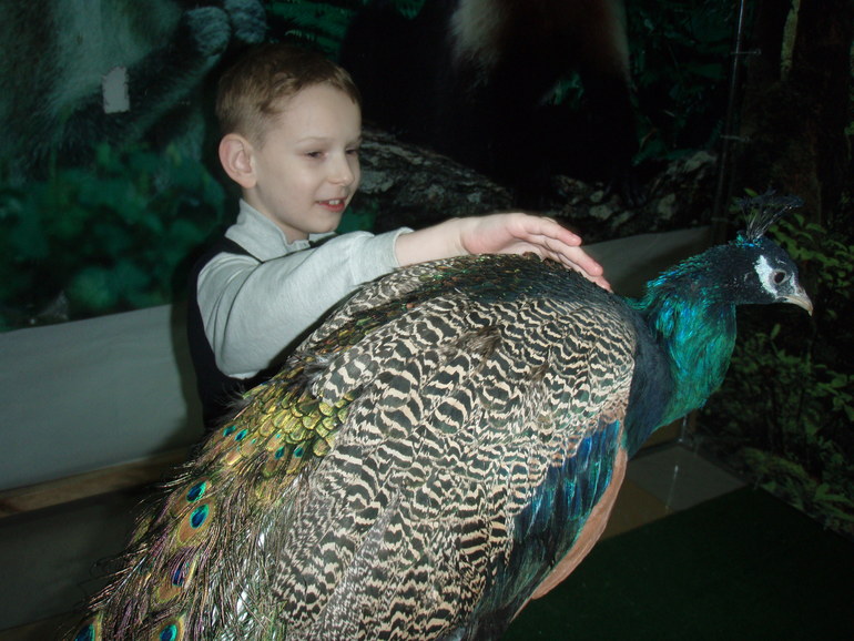 Животных немного; тех, которые контактные, совсем мало (павлин, попугай, кролик, пара морских свинок, ящерица, вроде, всё). Есть те, которых можно кормить сквозь клеточные прутья, но нельзя трогать, но они все настолько закормлены, что не очень-то едят. Хотя поименованный Егором Павликом павлин с удовольствием рылся в стаканчике с угощением, выбирая лакомство по вкусу.