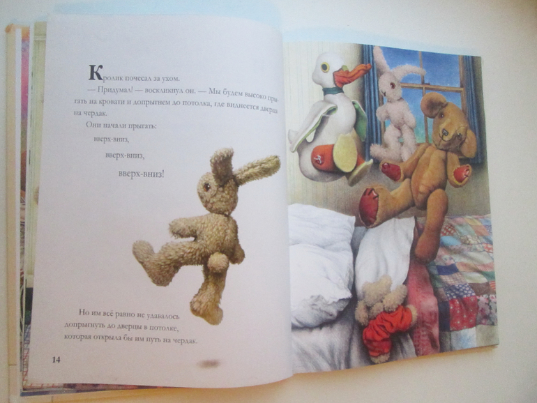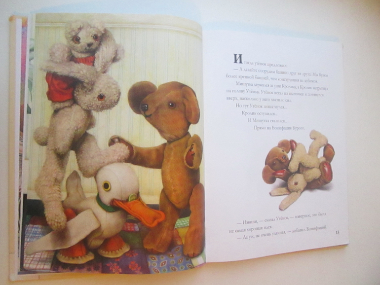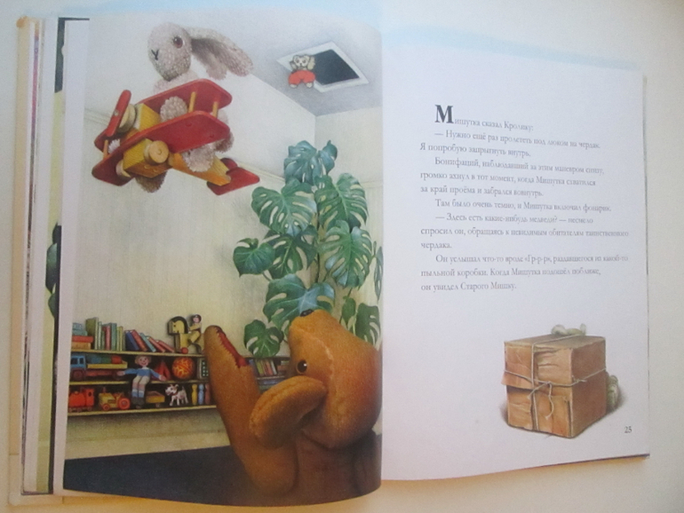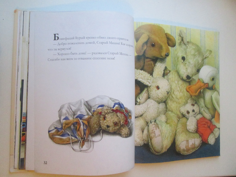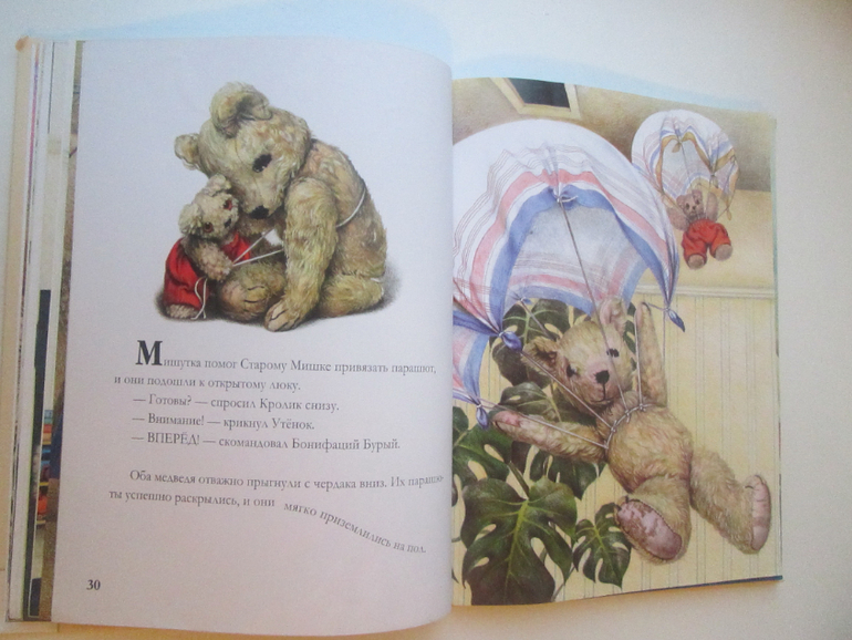 История Мишки такова, что друзья - Бонифаций Бурый (кстати, в российском издании его зовут Брамвел), Мишутка и все остальные решают высвободить с чердака своего старого друга Мишку, которого убрали за ненадобностью, так как он отслужил свой век. И мы действительно можем увидеть на рисунках, что у Мишки потёрты лапки, что у Мишки где-то шёрстка вытерта, что весь он немножко грустненький и «видавший виды». Но, конечно же, самые «заигранные» игрушки - они самые любимые. Мне кажется, мои дети это чувствуют, когда я читаю им эту книжку. И нам очень волнительно открывать ту страницу, где Мишутка наконец-то добирается до Мишки, и Старый Мишка сидит на чердаке в окружении всех этих пыльных вещей, и от ненужности никому в миллионный раз перечитывает лежащую рядом книгу...