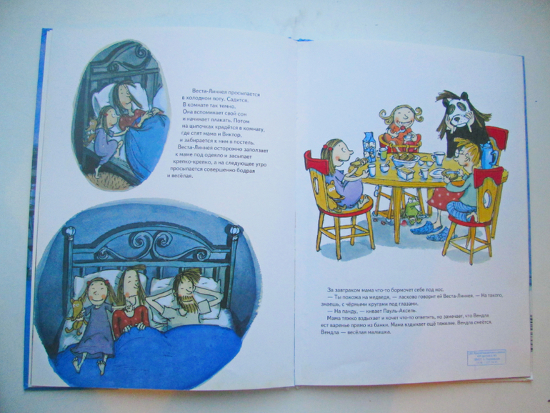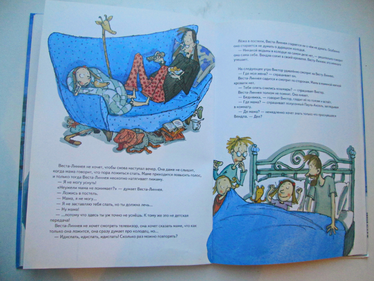 Книжка прямо-таки полезная, потому что в ней и многодетная семья с одной стороны, и тема сна в своей собственной постели с другой, с третьей стороны у девочки отчим, которого попросту называют Виктором, и никто не переживает по поводу необходимости называния его папой. И пока мама Весты-Линнеи точит бутерброды и рассматривает журнал с распашоночками, Виктор - бородатый и с зомбированным взглядом сидит за компьютером.