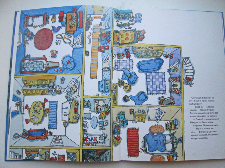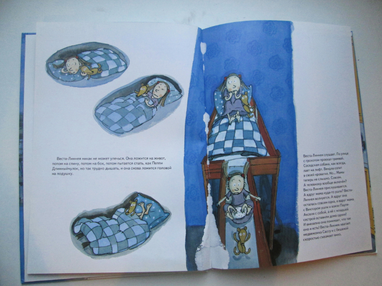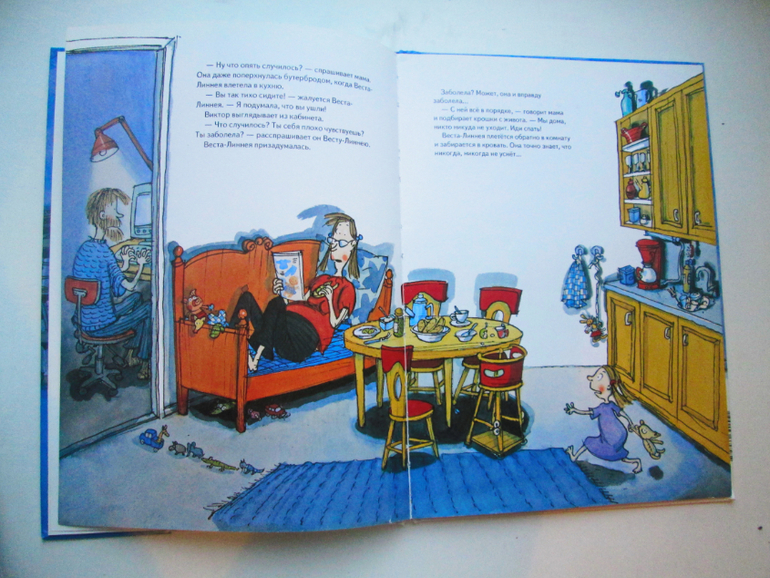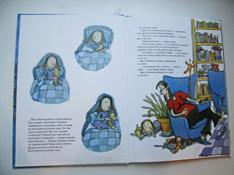 А происходит вот что - бедная Веста-Линнея не может уснуть, а мама смотрит в это время телевизор и трескает бутерброды (что ей, конечно же, в таком положении простительно). И Веста-Линнея понимает, что ей всё мешает. Если мама смотрит телевизор - мешает. Если выключит телевизор - это тоже мешает, ведь кажется, что мама вообще ушла куда-то! А в своей кровати снятся кошмары, и спать, конечно, лучше всего в маминой кровати. А маме, конечно же, это крайне неудобно. И есть очень смешной момент, когда мама, вытесненная с кровати дочкой, находит место для сна на двухэтажной дочериной кровати. В книжке есть схема квартиры, которую мы с Никитой подробно рассмотрели, где можно поискать мамочку, посчитать количество комнат, рассмотреть, что в этих комнатах находится - нам это очень понравилось.