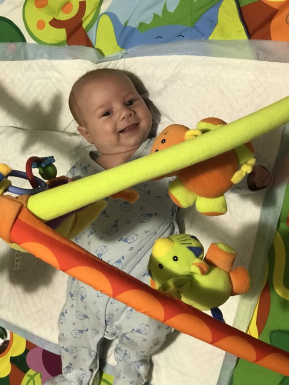 Стал раз в день засыпать в электрокачельке. Иногда лежит в развивающем коврике и болтает с игрушками.