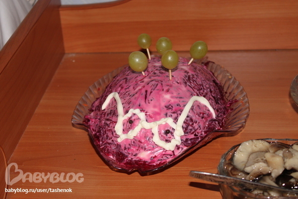 1. еж под шубой . изначально селедка под шубой. Далее мозг ушел в свободное плавание, сказала что это рыба-еж под шубой, зашел кум на кухню нарисовал ежу очки сказал, что это ученый еж в тулупе, зашел муж сказал, что это смешарик....