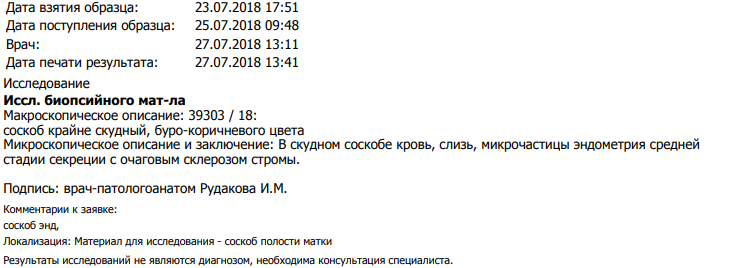 28 июля в 1 д.ц. мы снова приехали в Казань, но я не получила доступ терапевта из-за желудка. Тут я сначала плакала, потом ругалась. Ну как так можно, это же не только что выяснилось, неужели нельзя было заранее посмотреть все анализы, которые я привозила. Ну и сказались еще нервы, мы гоняли в Казань каждые выходные, а это по 8-9 часов дороги. Усталость была нереальная. Возник негатив, но он прошел как только я выспалась ) Когда мы ехали домой 28 июля, то по дороге позвонили и сказали, что готова гистология. Много фиброзной ткани, рассекли синехии и выскребли весь эндик, т.к. был очень плохой и рваный.