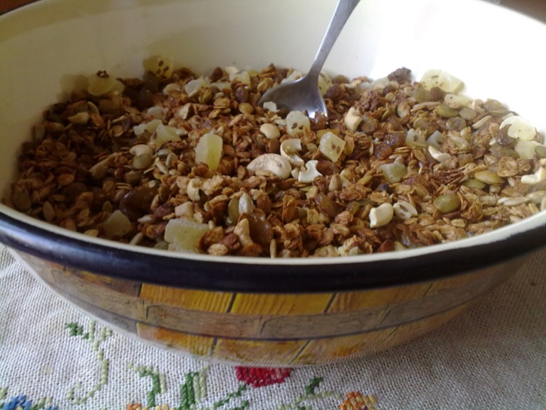 На завтрак сегодня сделала гранолу, попросту домашние мюсли. А то купишь неизвестно что и ищешь там на дне пару орехов и дохлый цукатик )))) Вкуснота... ! И домашние с удовольствием похрустели не подозревая о наличии семян льна, хих.