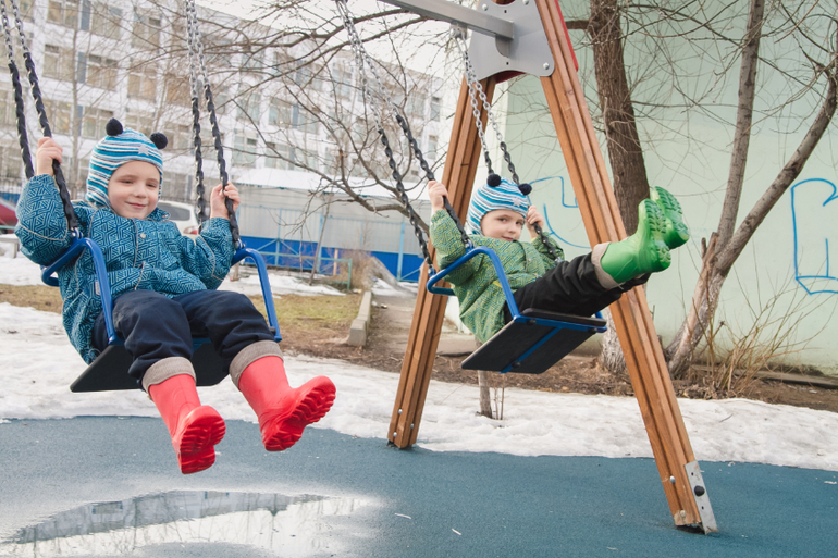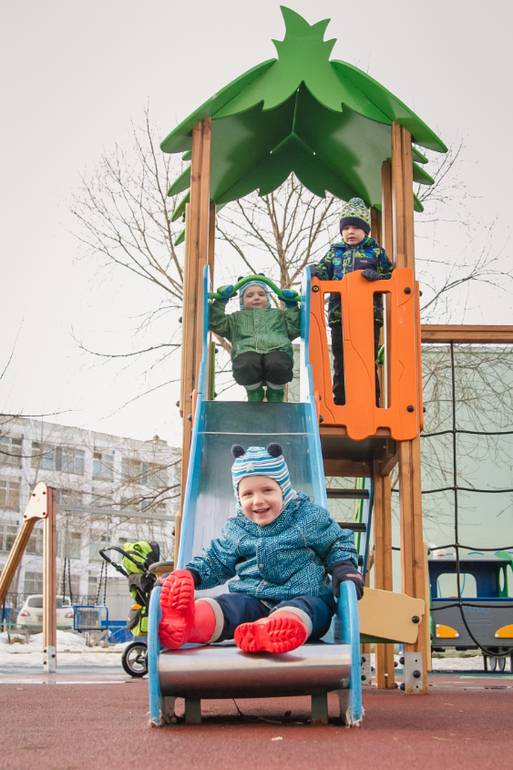 Вчера кружились на качелях, играли в догонялки и строили преграды ручейкам , протекающим по всем площадкам)