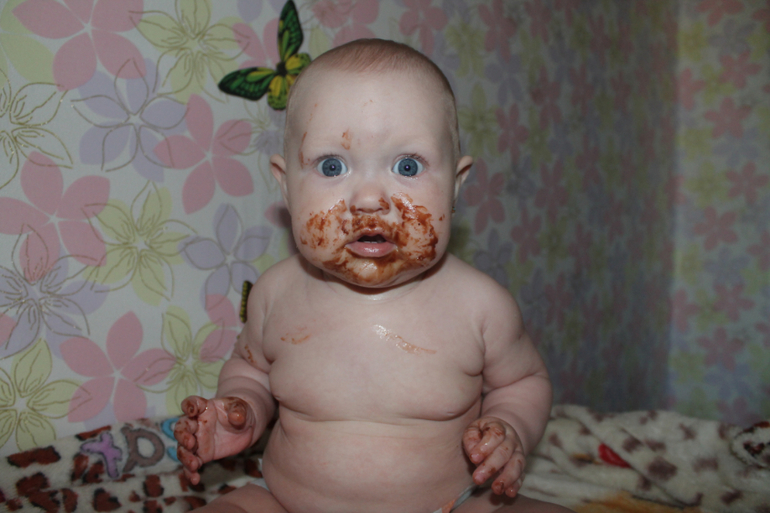 Развесила бельё, захожу в комнату и прихожу в ужас! Доча сидит с коричневым лицом, я не сразу поняла что это))) Подхожу,а вокруг неё лежит фундук) Шоколад съела,а орехи выплёвывала..