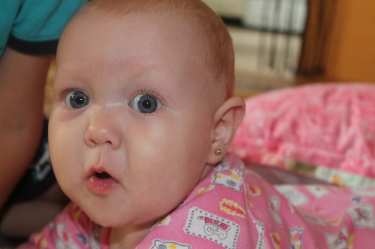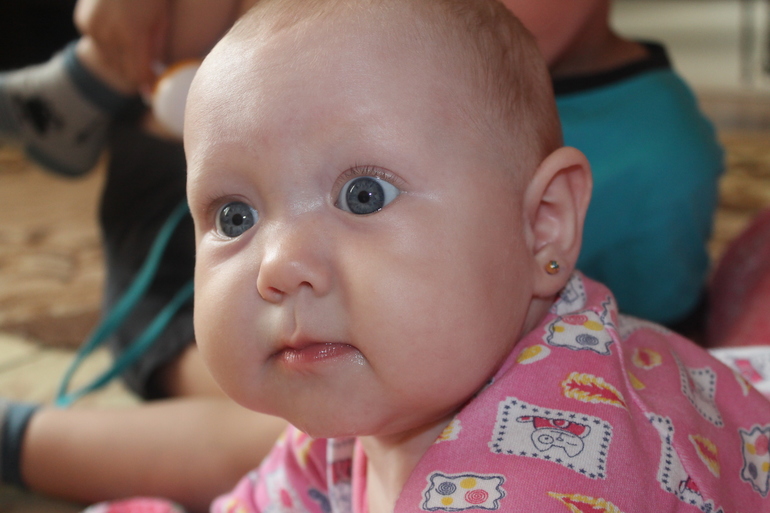 Зубиков пока 2 снизу.Еще очень сильно набухла и покраснела наша верхняя десенка, и видимо от этого Ксюшенька чаще стала просыпаться ночью, даже титю не всегда берет,видимо больно.