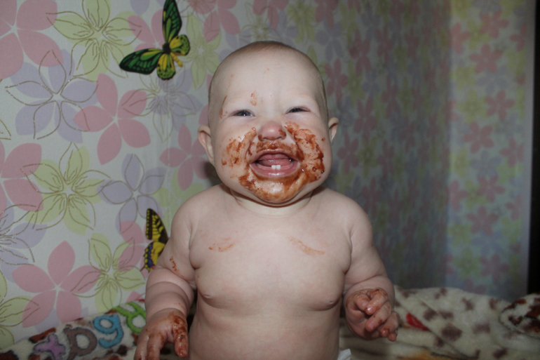 Развесила бельё, захожу в комнату и прихожу в ужас! Доча сидит с коричневым лицом, я не сразу поняла что это))) Подхожу,а вокруг неё лежит фундук) Шоколад съела,а орехи выплёвывала..