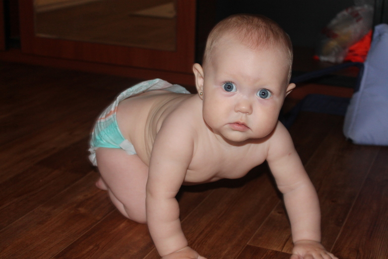 Напишу как Ксеничка передвигается. Ползать начала примерно неделю назад. Но очень ленится, ползает хорошо только когда я отхожу и она ползет, меня догоняет. Кричит,пищит и ползёт за мной..