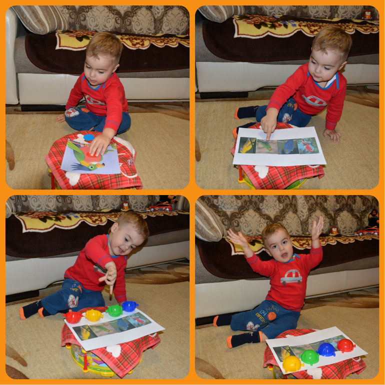 И я тут, вся такая воодушевленная, что сдвинулись таки цвета ( а то я вообще уже стала думать на нехорошее)))))достала другие игры - приетел к нам попугай на скатерть сел и попросил правильно закрыть ему грудку... легко... а вот с четырмя попугаями и шариками для них загвосточка вышла... да какая загвосточка - ступор- все не так делал, ладно хоть посчитали пару раз)))) После того, как мама правильно разложила, Илюня себе похлопал))))))