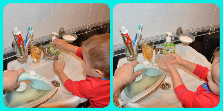 После нашего потопа я еще даже не погладила скатерть, и это оказалось не плохо - появился повод потренировать Илюшкины ручки - в набирании и наливании воды в утюг...