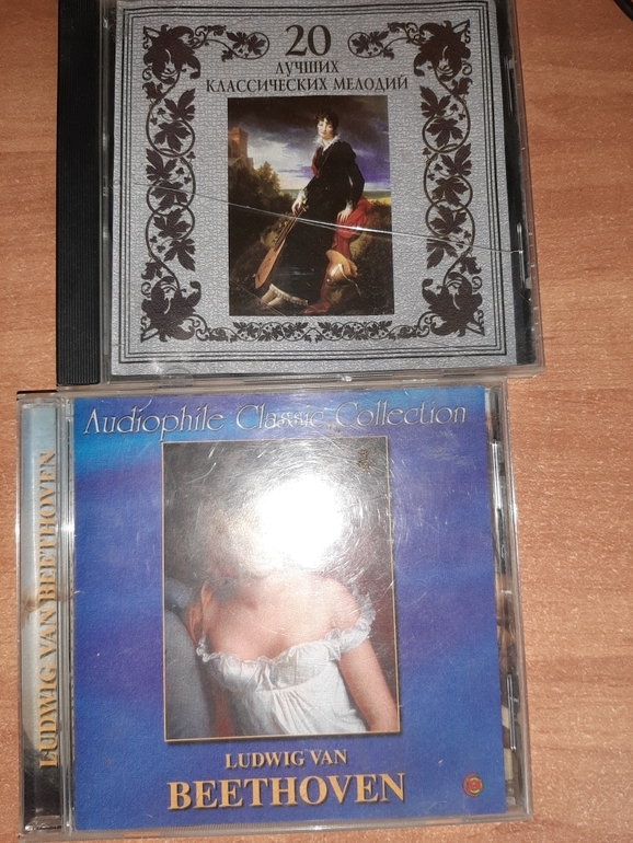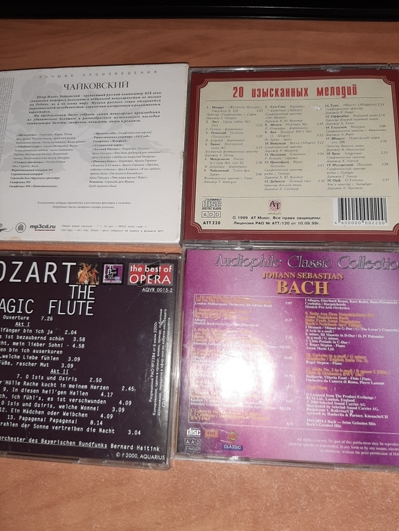 Все диски рабочие покупала для Муз литературы ( в Муз школу) 1) Чайковский идеальное состояние 300 э 2) Сборник классики 300 э 3) Моцарт 400 э 4 ) Бах 300 э 5) 20 произведений 300 э 6) Беетховин 300 э.
