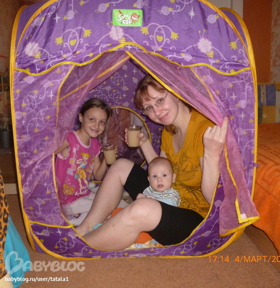 У нас квартира не большая и детской к сожалению нет, на какой-то из дней рождений подарили мы дочке вот такую палатку. Теперь я иногда говорю ей "иди в свою комнату ты наказана посиди и подумай" ей такие наказания очень нравятся )) А в этот раз сама пригласила нас в гости и чай приготовила.
