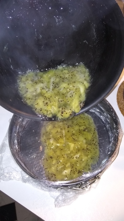 Добавляем набухший желатин к киви и выливаем в форму меньшего диаметра.