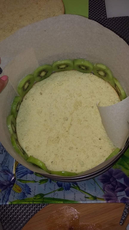 Кладём одну часть в форму. По краю кладём киви... Вот так...