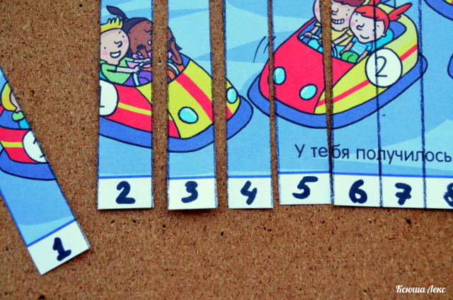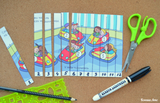 Вырезаем картинку, внизу можно приклеить полоску белой бумаги, чтобы нарисовать цифры. Разделяем картинку на части, подписываем цифры и разрезаем на полосочки.