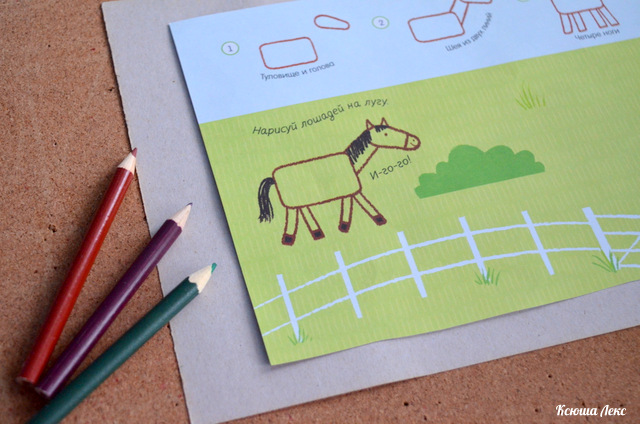 С другой стороны - приклеена раскраска, с примером, как рисовать лошадку.