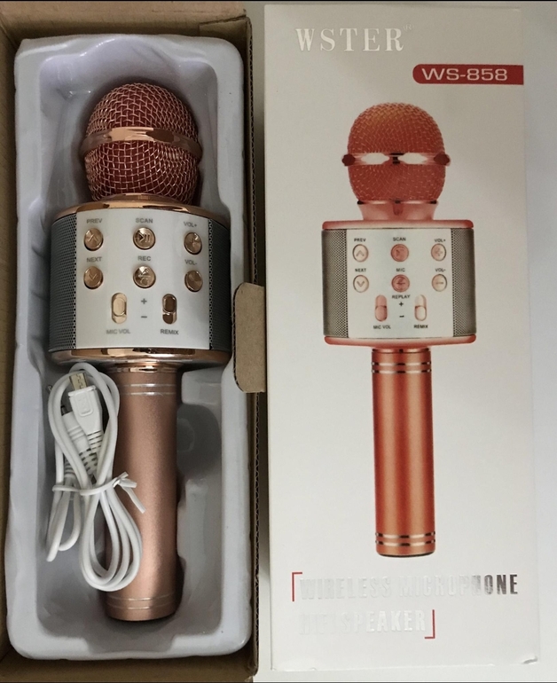 WS-858 - один из самых популярных караоке микрофонов. Встроенные динамики обеспечивают очень громкое качествненное звучания голоса и музыки! Этот микрофон можно подключить к телефону по Bluetooth. Можно воспроизводить музыку с USB флешки, или же с microSD карты.