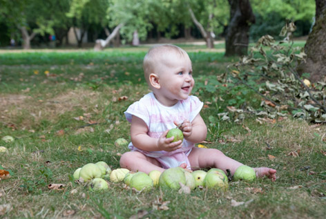 Маша, главный яблочный ценитель, даже растерялась от такого количества яблок, надкусывала каждое.